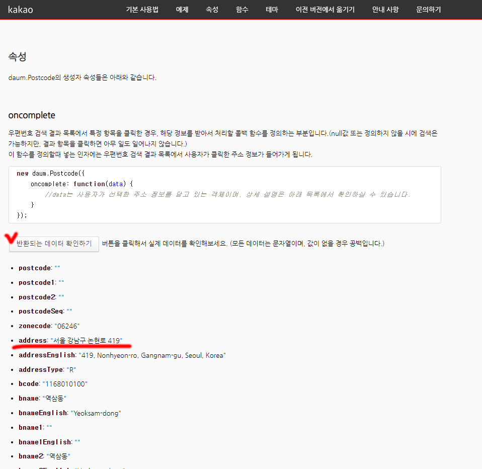 1) 주소 (https://postcode.map.daum.net/guide#sample)