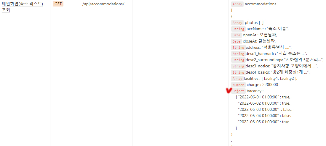 - 숙소 정보 DB에 "Vacancy" 라는 "객체" 타입의 값을 넣었습니다.